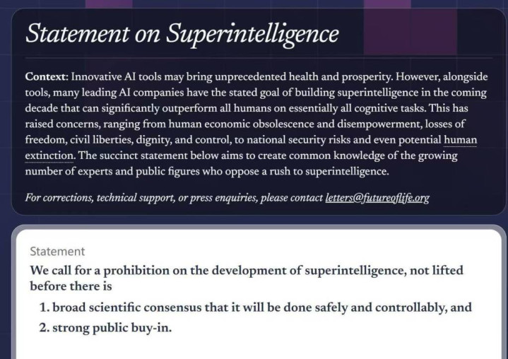 “超级智能”是一种在所有认知任务上都超过人类的人工智能形式。有别于当下绝大多数公司研发通用人工智能,“超级智能”的前景引发业界担忧。该声明称,许多顶尖AI企业将要打造超级智能,“引起了人们的担忧,从人类经济过时和被剥夺权力、自由、公民自由、尊严和控制的丧失,到国家安全风险,甚至潜在的人类灭绝。”